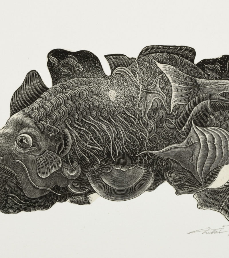 He is a world-class “koguchi” wood engraver who engraves fine images using a burin (chisel with a sharp steel tip) on slices of hardwood trees, such as cherry and boxwood. Received prestigious awards at the Kochi International Triennial Exhibition of Prints and the Exhibition of Japan Print Association. Collections of his works can be found in many museums such as the Zhejiang Art Museum, and Kanuma Municipal Art Museum of Kawakami Sumio.