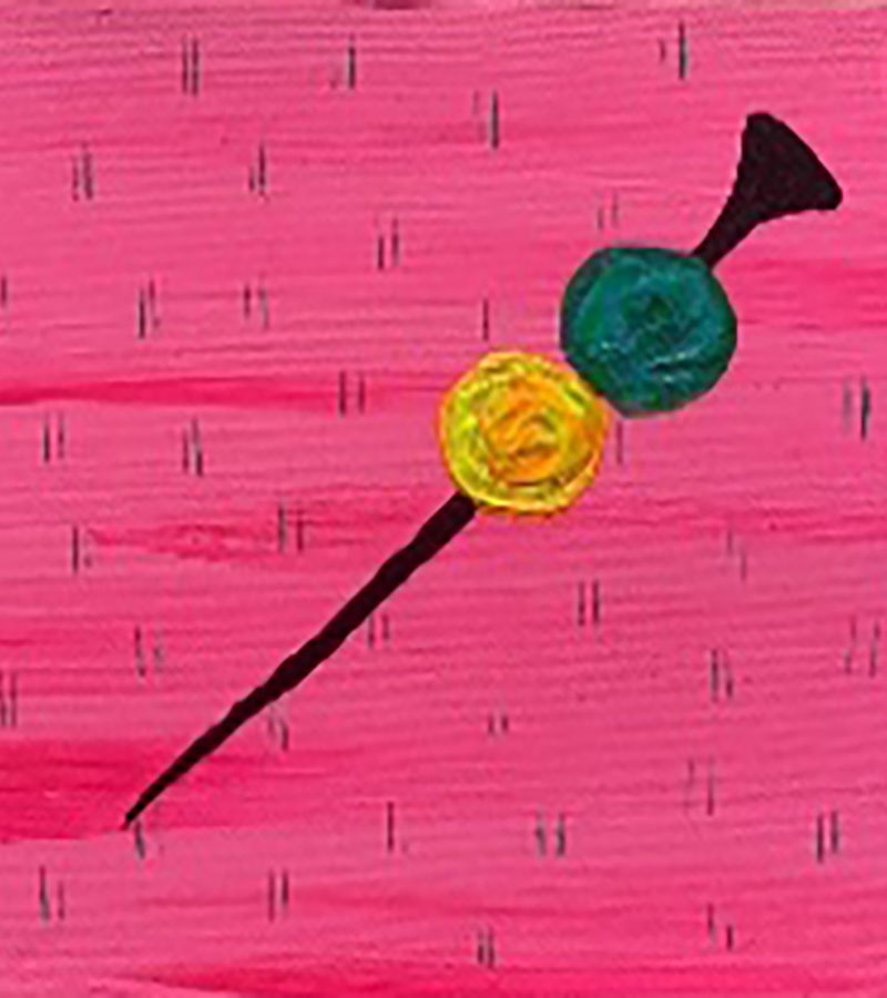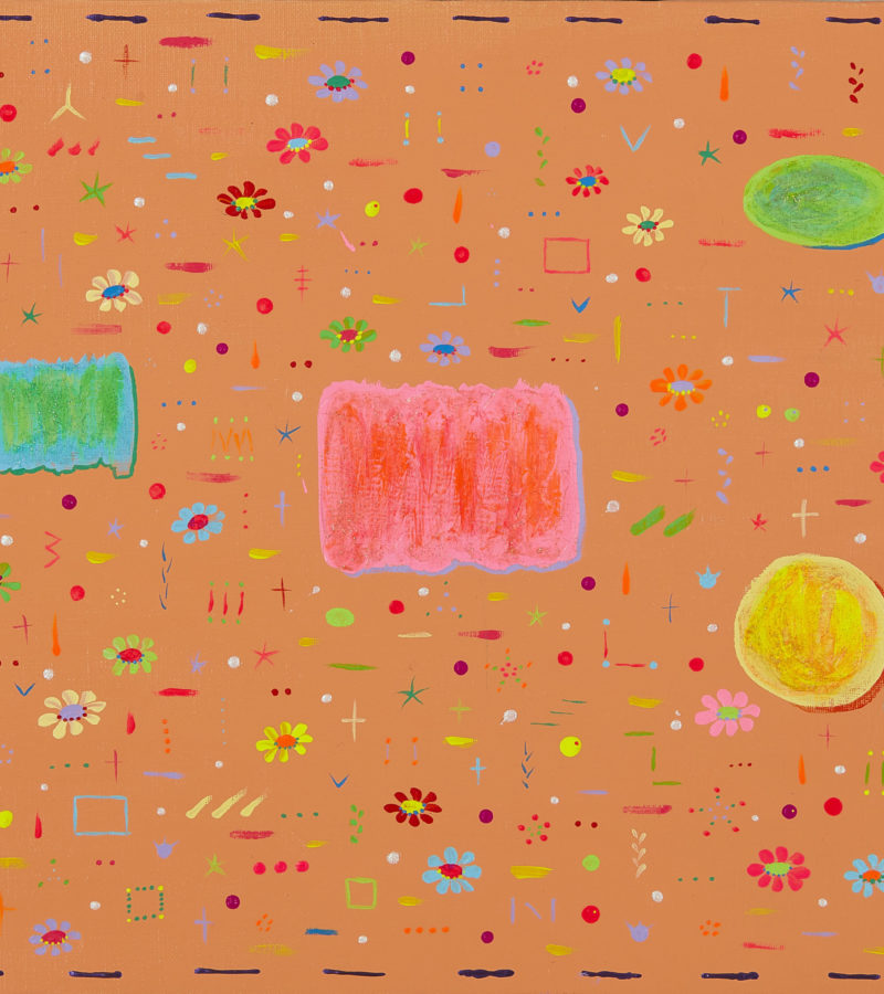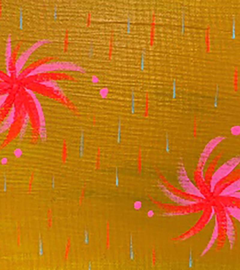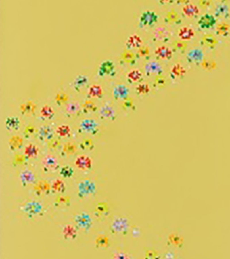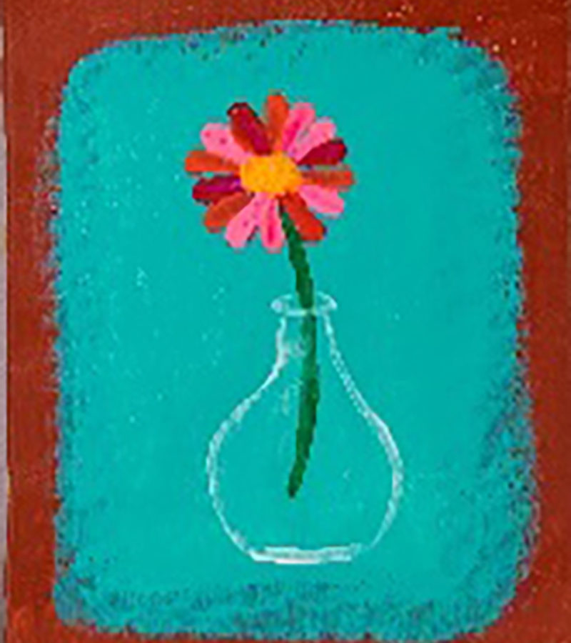 The first autumn winds gently stir the pink flowers like a pinwheel. The colors evoke an image of the changing season. The artist used her favorite colors and unique style to create this whimsical image for her fans.