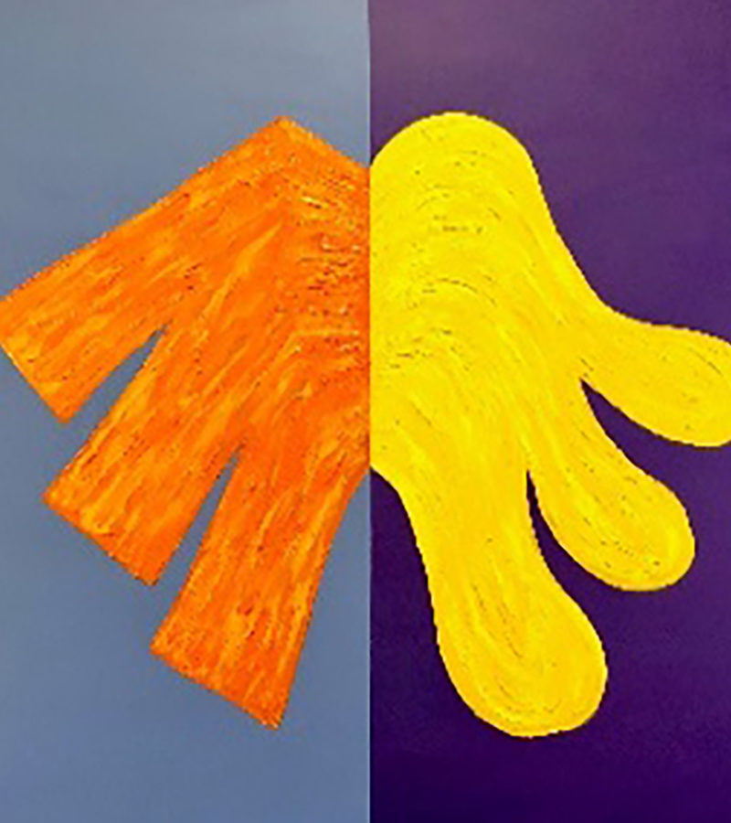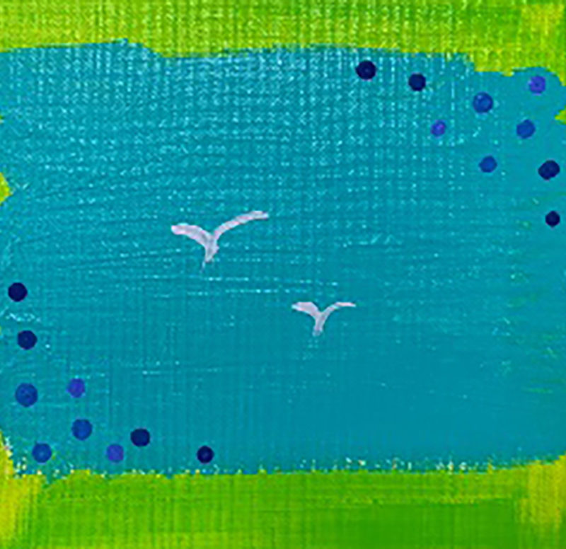 The artist said that she put her warm love into this simple artwork. She drew the two birds flying together in the clear blue sky in the image of her ideal couple who shares the hardship.