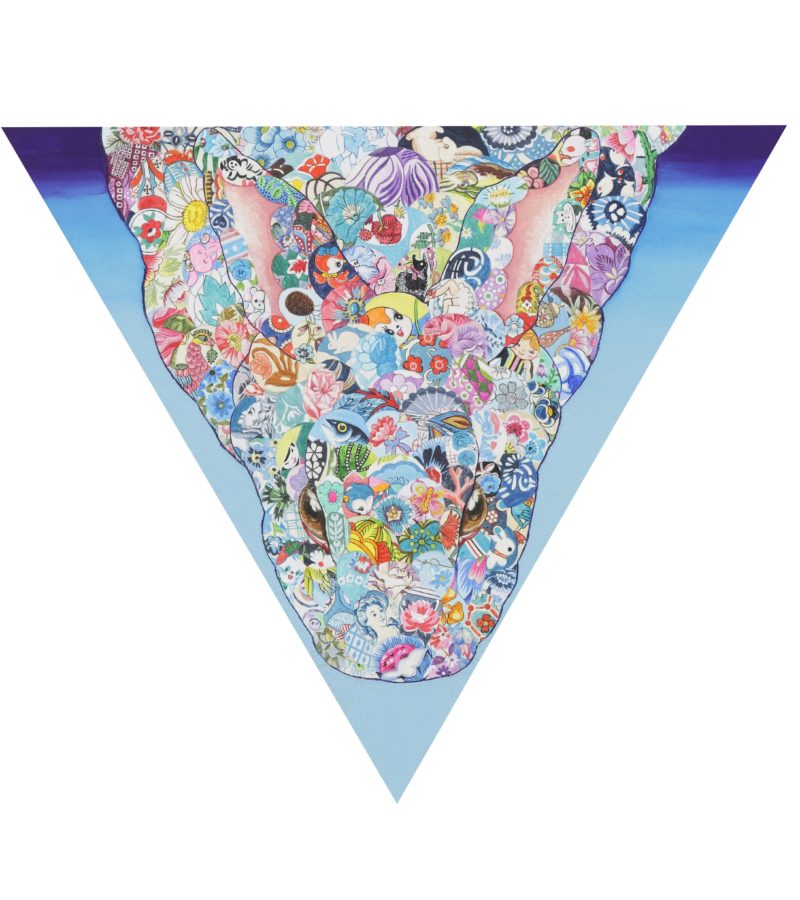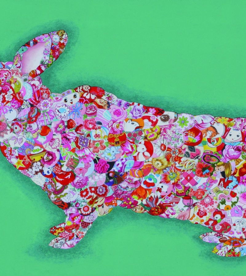 Rabbits are often referred as a symbol of beginning of spring, rebirth of lives lost in winter which sprouts and bloom back as grass, trees, and flowers. In Japan, rabbits have been worshiped since ancient times. After a long, quiet, dark and extremely cold winter, this sprout rabbit brings peace, joy and new life and encounters to us with this warm, heartfelt spring breeze. If you look at the rabbit closely, you can see the traditional patterns of sea waves colored in cherry blossom layered by detailed graphics and cartoons of the artist’s favorite animals and designs.