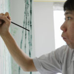 His main motifs are people, in particular parents and children, sceneries, and birds. His job is teaching painting to children.
