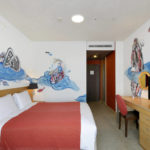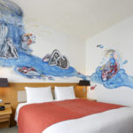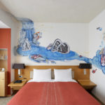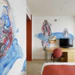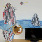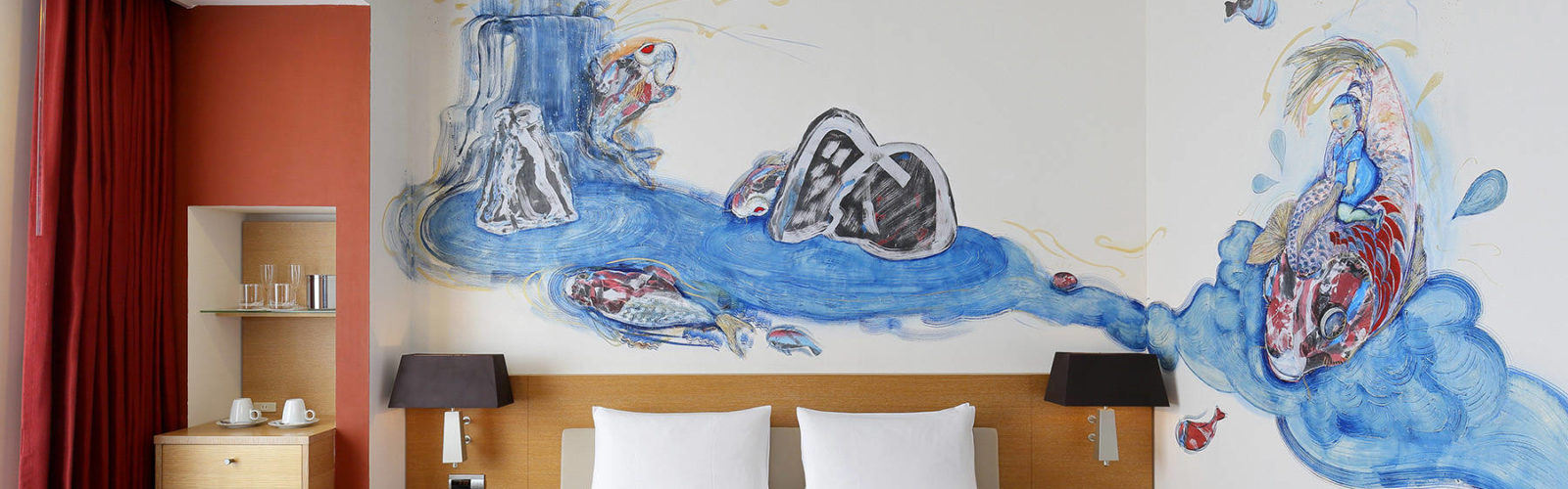 Next to the bed, there is the main mural, that of a boy who rides and plays on the back of a carp. Beyond, through the craggy rocks, a carp is trying to swim up a waterfall. The “carp” is a lucky symbol for people who wish the growth of their children and themselves. The artist hopes that the carp will also be lucky for those who stay in this room.
