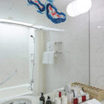 Artist Ms. Naito says she felt “the majestic swimming figure of the carp embodies the universal wish for improvement, progress, and prosperity”. From ancient times, the “carp” was regarded as an auspicious fish, and was vividly painted using various raw materials and techniques, such as collage with oil paints, acrylic paints, sumi (Japanese ink), and Japanese paper. At the entrance to the room and beside the window, he painted bengala (red iron oxide pigment), a traditional material used for shrines and Buddhist temples, so that overseas visitors can feel “Japan”.