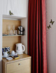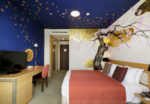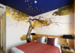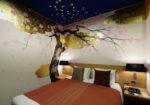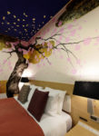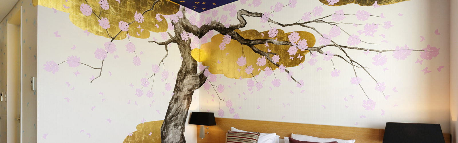 Ms. Otake says: “Japanese people took art into their everyday life with sliding doors and folding screens, from a long time ago”. I decorated a guest room by painting a cherry tree, so that the corners of the room were like the folds of a folding screen. As soon as you enter the room, you see a big cherry tree covering the bed. By drawing cherry blossoms like butterflies which are a symbol of transiency or the soul, I expressed the beauty of the end of life. As it flies around the room, a butterfly expresses the cycle of the four seasons – spring, summer, fall and winter. And I did the gay golden clouds beyond the cherry tree with about 400 gold leaves carefully affixed one by one. When you stretch out on the bed, butterflies in the shape of cherry blossoms will dance all around you. But outside the window, you will see an urban landscape against the scenic backdrop of Tokyo Tower. This contrast reminds us that all things are transient. I hope you enjoy the Japanese sense of beauty in the artist’s room “Cherry blossoms”, with its falling cherry blossoms.