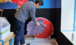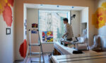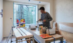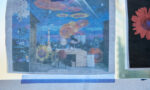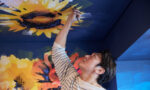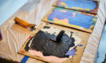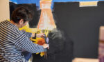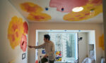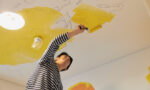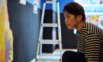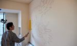 Sato employs paint rollers to create not only canvas works but also murals and live paintings.