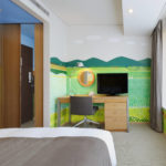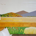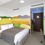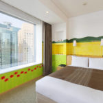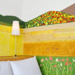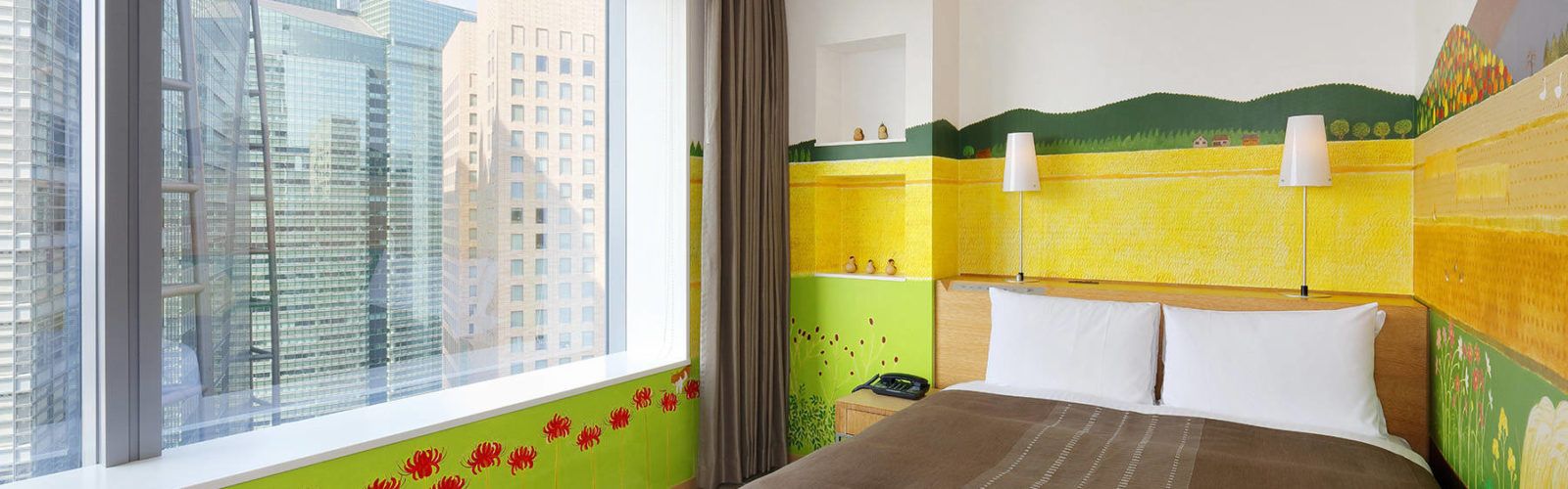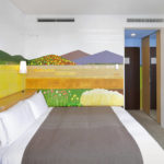 “I wanted to create a world which would fill the guests with calm” said Ms. Ito. In a room in the Shimbashi area, looking out onto a cluster of buildings in the middle of the city, the scenery of Japan’s Satoyama Landscapes is drawn, depicting people living in harmony with nature, the changing seasons unfolding like a picture scroll being unrolled. With its gentle, familiar colors, stepping into the completed room is rather like walking into a picture book.