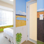 Inside a closet to the left, just as you enter the room, is a field of rape blossoms. Then, on the walls, there’s a rice field that’s just been freshly planted. If you continue to the right, the rice grows, and we see a scene of the changing seasons, with windows sandwiched in between. With autumn come hanging, golden-colored heads of rice. Each wall depicts a different season, but whichever one you look at, you can’t miss the distinctive plants and animals of “Satoyama Landscapes”. Spring rape blossoms, swallows, tadpoles. Summer frogs, ants. The autumn cosmos, sparrows and winter foxes. Also, the artist wanted to depict the summer nights on the ceiling, so when the lights are turned off, you can see fireflies and the Milky Way in glowing fluorescent paint. In Artist Room Satoyama Landscapes, have a relaxing stay, while searching for Japan’s seasons in the walls.
