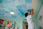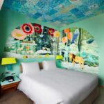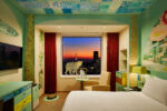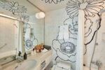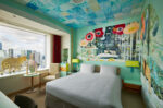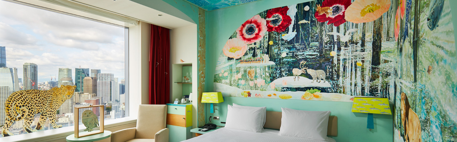 We feel happy when everything in our field of vision seems important. I paint by adding to the canvas what I most want to paint the day, filling every corner of the screen with the most important parts of the paintings. I took the idea of “borrowed scenery” from Japanese gardens and extended that world outside of the painting. In this room, everything from the desk to the trash can complements each other. I further aimed to extend this to the view of Tokyo outside the window. Unlike the beauty of the natural world, which consists of simple regularities, I saw the diversity of the human nest, and I thought it was beautiful too. This ceiling painting is made up of 143 “water surface paintings” drawn by hotel employees and guests. Looking up from the bed, no two water surfaces are the same. This room is covered with “a world that does not aim to be one, but to be one”. The artwork “TOKYO borrowed scenery” is a world where inclusion is realized, where nature, the city, people, and everything in sight seems to be important.