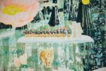Various motifs such as animals, plants, and humans fill the canvas with a mixture of vivid colors.