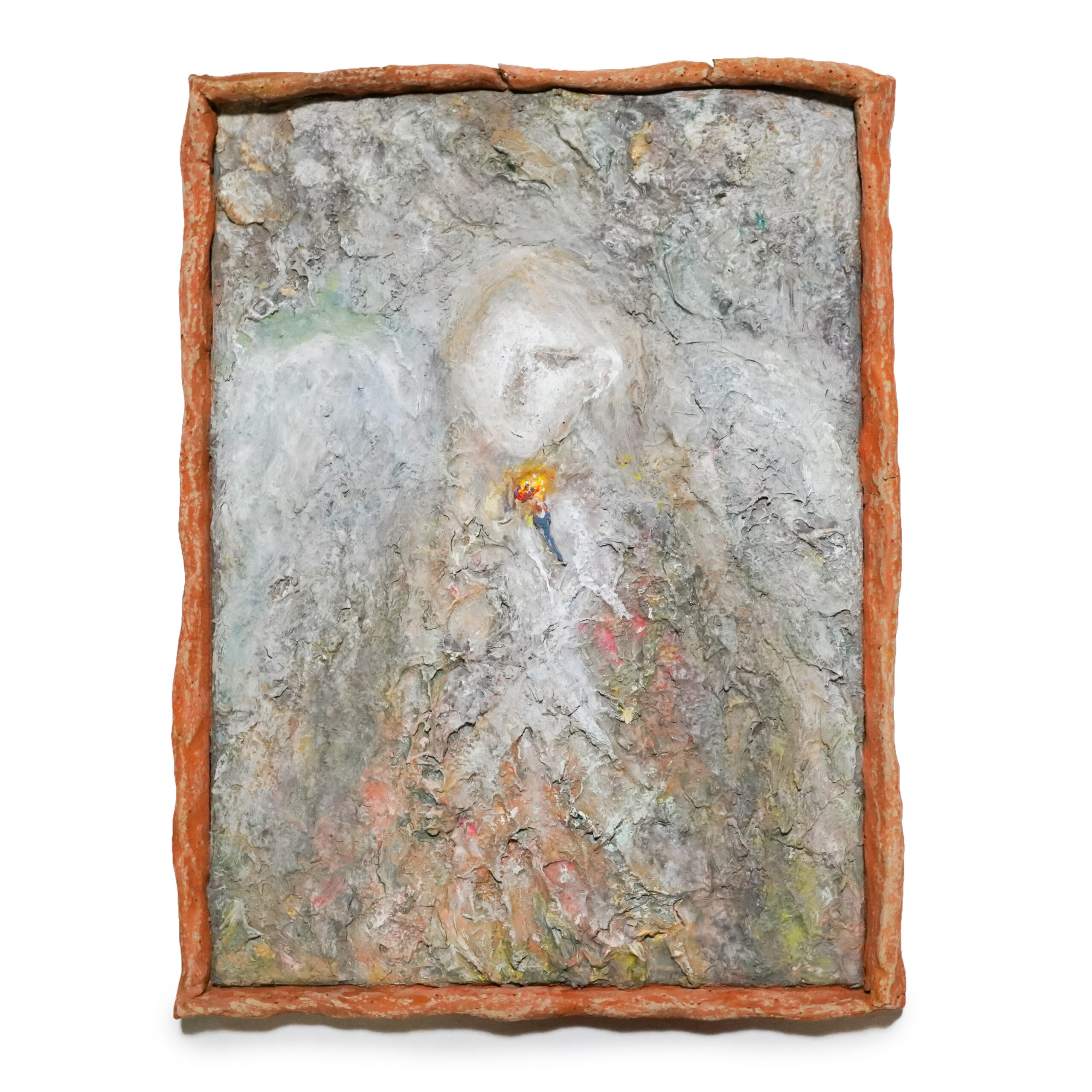 困難の中で対話するように描かれた「天使」は、作者の内面に潜む理想像であり、その表情には全てに対する赦しのような微笑みをたたえています。