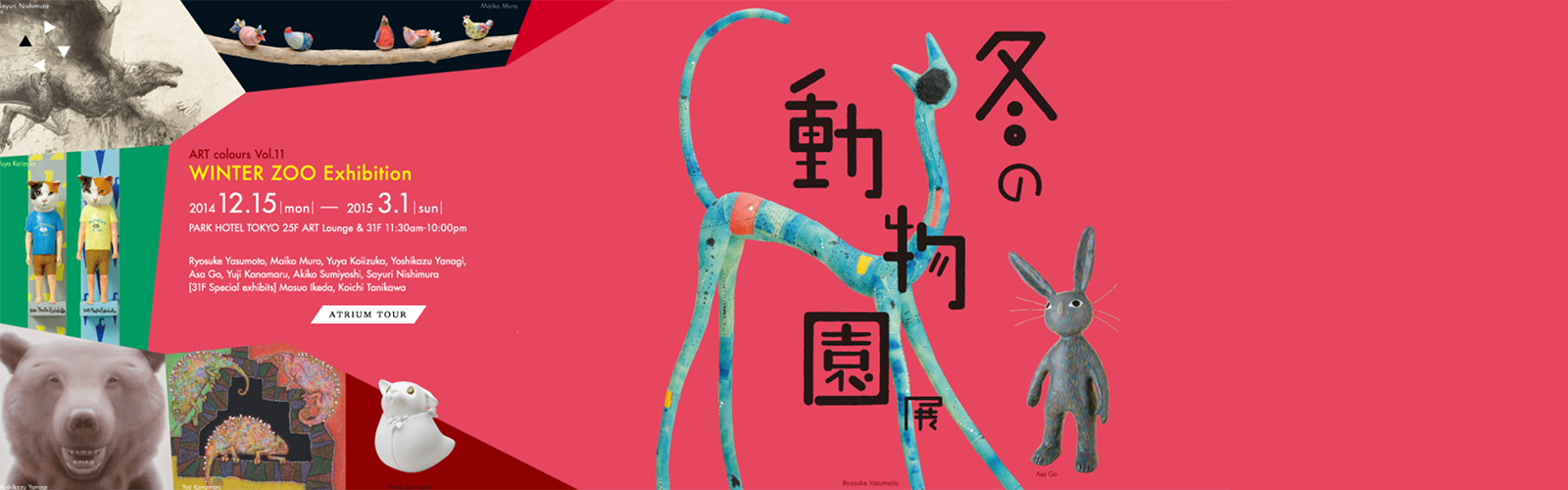 冬に動物園?! 動物たちも見ている私たちも、じっとしていると凍えてしまいそうな季節です。でもこちらの動物園は暖かなパークホテル東京のアトリウムの中。現在活躍中の八作家(安元亮祐、室麻衣子、小飯塚祐八、柳ヨシカズ、呉亜沙、金丸悠児、住吉明子、西村沙由里)が制作した様々な動物たちの作品をあつめ、ゆったりとアートの世界の動物園を楽しんで頂けます。
