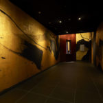 地下二階にある「間」という空間はお部屋ではなく、エレベーターホールです。色味は金を基調としていますが薄暗いため、もの悲しく感じる方もいらっしゃるかもしれません。しかし、この空間の意味を知れば捉え方が変わってくるでしょう。この空間を手掛けたのはアーティストルーム歌舞伎の制作者でもある、OZ-尾頭-山口佳祐さんです。OZさんは、「露地」からインスピレーションを受け、この空間の制作をしました。露地とは、茶道で大切にされている空間で、茶室に向かうための庭園のことです。しかし、お察しの通り、ただの庭園ではありません。茶室は神聖な場所とされており、露地は非日常的空間に向かうための心の準備や、精神統一をするために設けられています。もちろん、ゲストがホテルに向かう間に精神統一をする必要はありません。しかし、地下鉄から繋がっている「日常」の空間から、ホテルロビーに繋がる「非日常」の空間に誘う「間」が、あなたの来館を特別なものにするのです。パークホテル東京という私たちが最大限のおもてなしを提供する場が、お客様にとって茶室のように感じて頂けたらと思っています。
