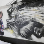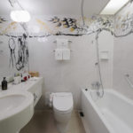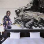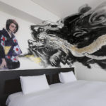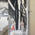 堂々とした龍が、玄関からベッド、さらにはバスルームまで部屋全体を横切っています。この龍は、純粋さと希望の象徴である色とりどりの着物を着た若い女性をじっと見つめているように見えます。また、部屋の中には他の人物も描かれていますが、これは作家があえて日本の古い時代を表現したもので、高層ビルが林立する現代の東京のパノラマと、部屋の中の人物の日常的な姿との違いを際立たせています。