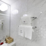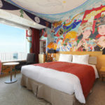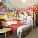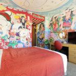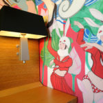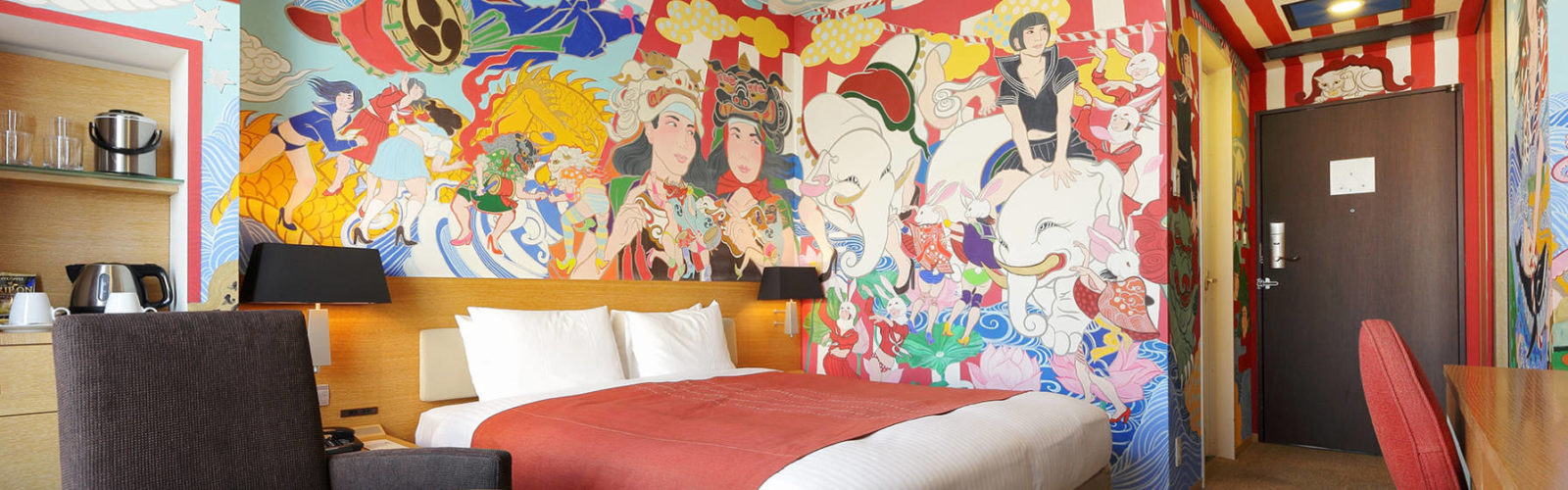 日本で「祭」は夏や季節の変わり目など、特定の時期に行われるのが一般的です。祭は、日本人の自然との深いつながりに由来しています。私にとって祭と言えば、色、喜び、踊り、屋台料理、音楽を連想します。アーティストの石原七生さんは、お客様に終わりのない祭りを楽しんでいただきたいという願いを持ってこのアーティストルームを作りました。実際、数あるアーティストルームの中でも最もカラフルな部屋のひとつであるこの部屋に入ると、動物や神話上の生き物、踊る人々のイメージの力強さと暖かさに包まれているように感じます。印象的なのは、ベッドや机の周りから天井に至るまで、この部屋の壁のすべての部分が完全にペイントされていて、余白がないことです。ゾウ、龍、トラ、タコなどの親しみやすい動物や、日本らしい制服を着た女学生、面白いマスクをした人などのキャラクターが、部屋に入った途端に強烈なインパクトを与えます。