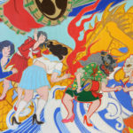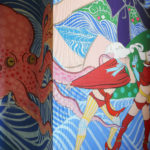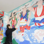 壁から天井まで、所狭しと描かれた人間や動物たち。赤の垂幕をベースに、ウサギもゾウも、神様も女子高生も一緒にお祭りで踊ります。