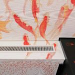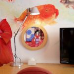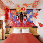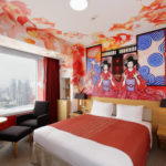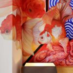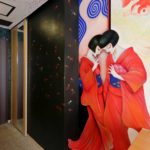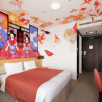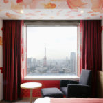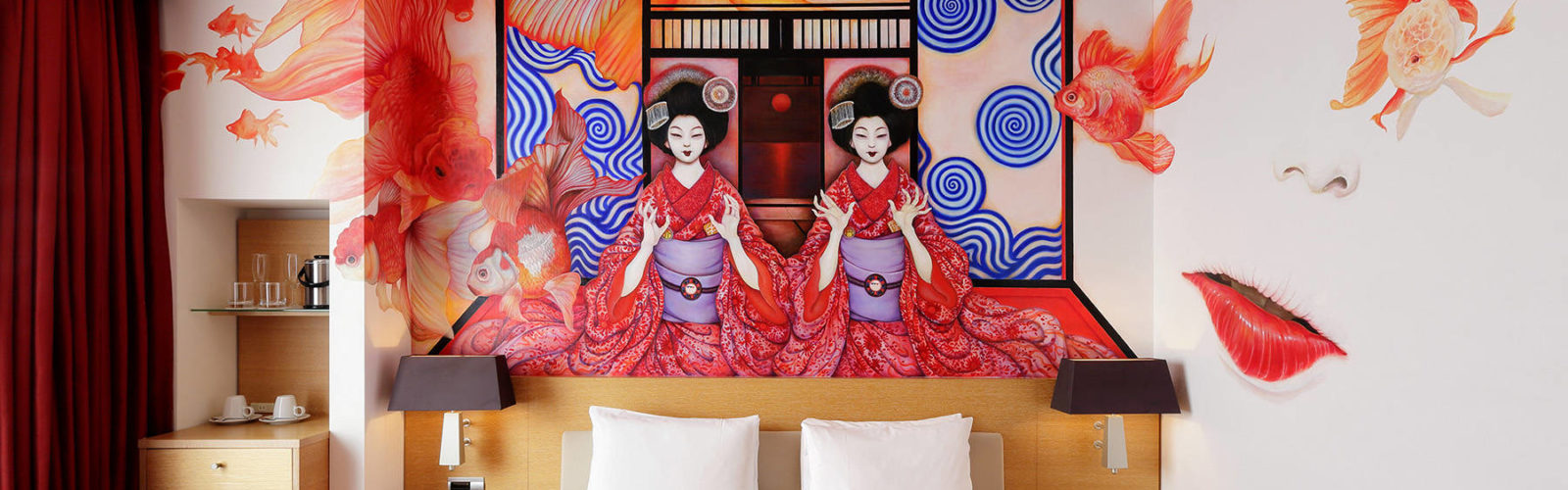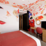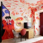 「窓から外を眺めたときに、水槽の中にいるようなイメージが湧いた」という成田さん。客室を水槽に見立て、このプロジェクトでは初めての画材となる油絵の具で壁紙に挑戦、7か月という時間をかけて、赤い金魚を壁面のみならず天井にも作画いたしました。まるで宙に浮かんだ水槽という御座敷で遊ぶ、芸者の出で立ちをした妖艶なる金魚たち。縦横無尽にひらひらと泳ぐ金魚が、部屋にいる人間に不思議な浮遊感を感じさせてくれます。「古来、縁起物として名高い金魚に囲まれた部屋で見る夢が、宿泊するお客様に幸運をもたらしますように」という思いで描き上げました。