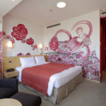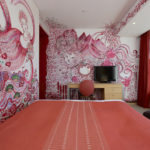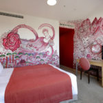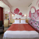 部屋いっぱいに咲き乱れる薔薇と天女に包まれたこのアーティストルーム クイーン 天女で優雅なひと時を過ごしてみてはいかがでしょうか。「バラというと西洋の花というイメージが強いですが、日本には万葉集のころから『いばら』『うばら』と言われた一重の薔薇が咲いていたのです」と話す蜷川さん。花の女王ともいわれる薔薇は、愛と美の象徴として扱われることも多く古くから、想う人への気持ちを伝える花として用いられてきました。このお部屋の中には赤やピンクに彩られた薔薇が壁一面に描かれています。そこに舞い降りた美しい天女は薄い羽衣を身にまとい、優しい表情でこちらを見つめています。実はよくみるとバラベイビーという名のキャラクターやバラルーナという一角獣がどこかに隠れているのだとか。