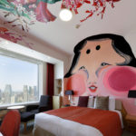 「おたふくの顔に、日本の美のすべてが詰まっていると感じた」という近藤さん。部屋に入るとまず目に入るのは、微笑みを浮かべて宿泊者を迎える大きなおたふくの顔。近藤さんは「五徳の美人」とも言われ、古来人々のお手本にもされていた「おたふく」の顔を描くことで、慎み深さや謙虚さといった、日本人の心の美しさを表現いたしました。また反対側の壁には、その控えめで静かな姿が日本人に愛されてきた梅の木が、壁のみならず天井まで描かれています。ベッドを包み込むように描かれた梅の木は、遠くから見れば力強さに溢れ、近くで見れば繊細で、一つ一つ違う表情を見せてくれます。