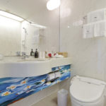 その他にも、テレビ横の丸い鏡からベッドを覗いて見てみるとおたふくがこちらを見ているように感じ,どこにいてもおたふくに見られているように感じてしまうかもしれません。しかし、徐々に時間を共にし、見る場所を変えて見てみれば色々な表情をみせてくれるおたふくに愛着が湧くことでしょう。クローゼットの中にも日本の伝統的な遊び、福笑いの絵が描かれており、遊び心もくすぐられます。このお部屋は天気の悪い日や気分が優れない日などにも元気をもらえる、そんなお部屋だと思います。