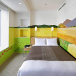 「ゲストの方が穏やかな気持ちになれるような世界を描きたかった」という伊藤さん。新橋方面の都心のビル群に臨む部屋に、人と自然が共生する日本の「里山」の風景を、季節の移り変わりに載せて絵巻物のようにぐるりと描きました。まるで絵本の中に入り込んだような、懐かしくも優しい色調のお部屋が出来上がりました。