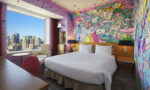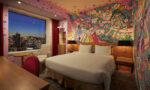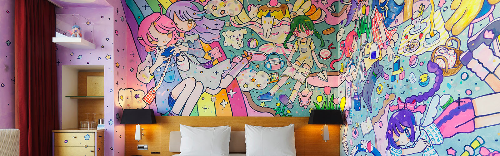 壁に描かれた少女たちは、東京上空のこの公園で自由に軽やかに遊んでいる。旅行中の非日常をさらに感じながらもリラックスできる、パステルカラーでドリーミーな客室として仕上げた。
