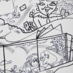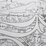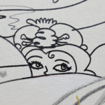 優雅に横たわる巨大なマロン太夫(たゆう)の手にした煙管からただよう金色の雲から垣間見えるのは、 現代を象徴する東京スカイツリー®と東京タワー、空飛ぶお寿司やラーメンガール!?