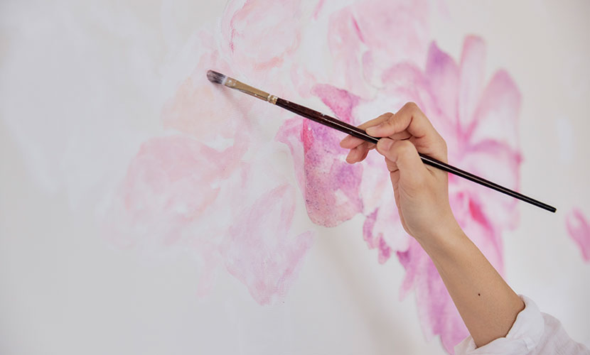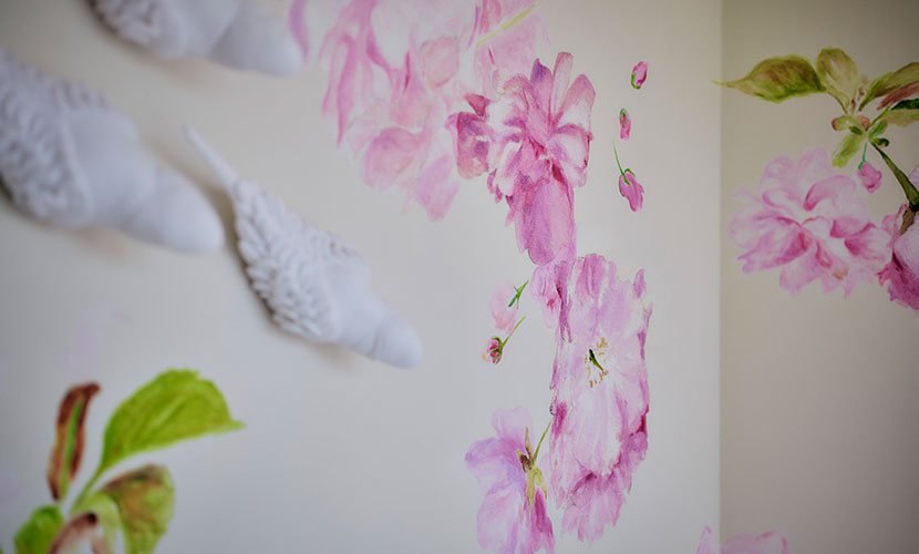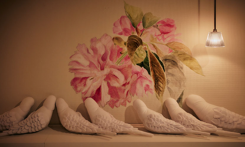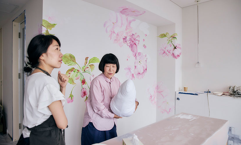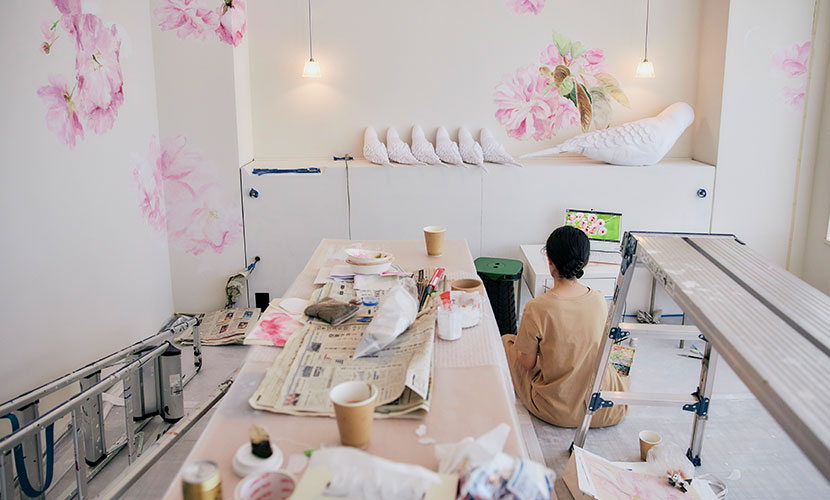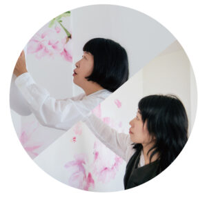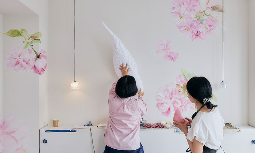 現実離れした大きさの桜の花が放つハッピーなピンクに囲まれて、自由に遊ぶのは柔らかく、抜けるように白いインコたち。画家・中内渚は、1000年以上前の平安時代からお花見で愛でられてきた八重桜を、自然の枝ぶりそのままに描き出しました。とことん豊かで争いのない桜の園に、安心して生息するのは、川上和歌子が真っ白な布から生み出したインコたち。普段は個性豊かなインコたちもここでは仲良く共存できます。このピンクと白の多幸空間に包まれているうちに、いつの間にかインコたちと同化して、この理想郷の住人になっているかもしれません。このような世界が部屋の外にも広がっていく日を夢見て!
