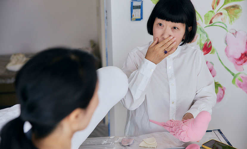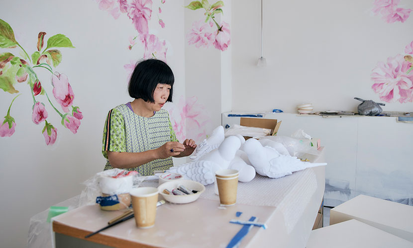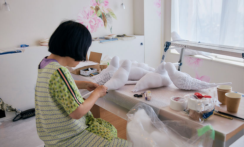 顔のないひとがた、自身を模した人形など、布地を用いたインスタレーションを発表。近年は作家の等身大ほどの巨大インコの群れを国内外で展開。日々夥しい数の作品をひとりでつくり続けている。