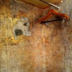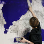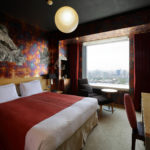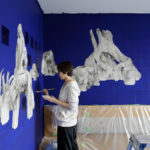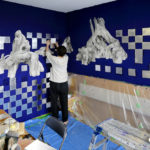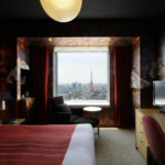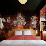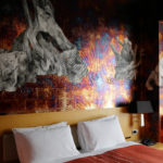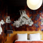 「ホテルの方々と制作協議を重ねていくうちに、私自身が制作でよく行っている硫化した銀箔と日本庭園の枯山水のイメージが結びつき、侘び寂びというテーマが生まれました。」と話す原さん。石庭として有名な京都の龍安寺の枯山水を題材に、近年アーティストが好んでモチーフとしている「流木」を庭石に見立てて描きました。また、日本画の伝統技法、画材の一つである箔を用いて、銀の箔を壁に貼り、薬品をかけて硫化させることで、壁全面を赤茶色、青などさまざまな色に変化させました。