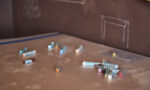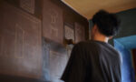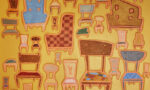 私は普段、人物の見立てとして椅子を描いています。椅子や日用品を描くことで間接的にその持ち主を想起させるのが制作の狙いです。そして実際の窓の向かいの壁面にたくさん椅子を描きました。集合写真のような構図で描きました。