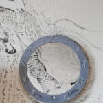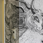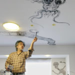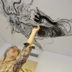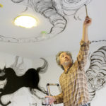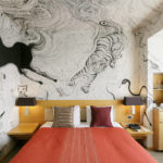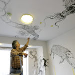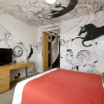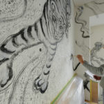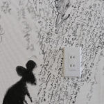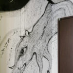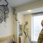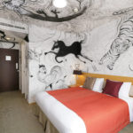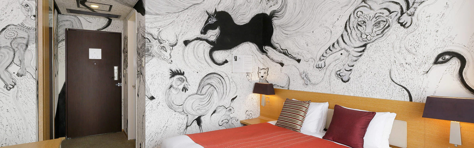 部屋全体を埋め尽くす、今にも動き出しそうな動物たち。「昔々の面白い 干支ものがたりを感じてもらえたら嬉しい」という安元さん。ネズミに騙され干支から外された猫と、神様のお情けで12ヶ月の最初の日をつ・いたち(一日)にしていただいたイタチも特別出演しています。また、滞在するお客様に楽しんでいただけるよう、部屋にはちょっとした仕掛けが。ベッドに横たわると向かいにある鏡に映った虎と目があったり、カーテンをめくってみると、お猿さんが隠れていたり…平面ではなく、部屋の壁(と天井)というキャンバスだからこそできた、これぞ滞在型アートです。