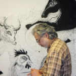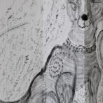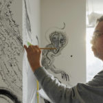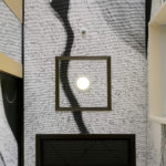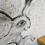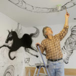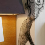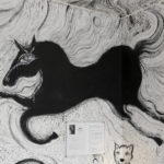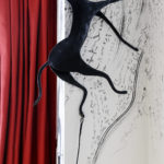 安元の描く世界には擬人化された動物・男・女・道化師たちが見知らぬ街に登場、何故か懐かしさや郷愁を感じさせてくれます。アクリル絵具の他、身近な素材(雑誌の切抜き、植物の蔓や根、ダンボール)などを絵具と同じような感覚でコラージュした作品を主に制作していますが、この壁画(Artist in Hotel プロジェクト)のように墨一色で描く自由なドローイング作品のように、度々行う舞台美術での即興性のある仕事も得意としています。