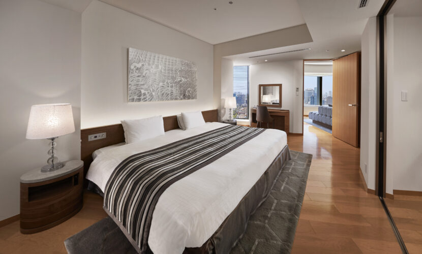 奥のベッドルームには、落ち着いたアートと広いキングベッド。夜景とともにゆっくりと心が静まっていく、穏やかな夜を過ごせます。気ままに過ごしながらも、自然と自分のペースが整っていく。パークスイートは、そんな“大人の滞在”に寄り添う空間です。