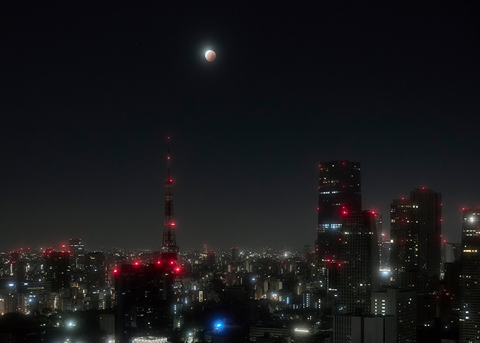 都心の夜景とともに、赤く染まる月が静かに空を彩る幻想的なひととき。