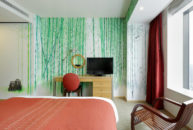 When you enter the room, the first thing you’ll notice is the fresh green color. Then the bamboo trees stretching straight up to the sky, making you feel just as if you were going deeper and deeper into a bamboo forest. Nishikawa said: “I wanted people who were tired of the bustle of city life to be able to really relax in this room”. The room was designed with various situations in mind, such as the view when a guest stands at the corner of the window, or the view when lying down on the bed. The artist changed his materials and colors depending on the position in the room, and coordinated the whole space while keeping it simple.