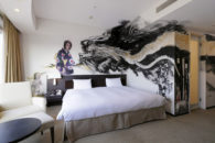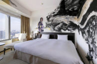 “Artist in Hotel” means that an artist stays in the hotel himself, and while absorbing the atmosphere of the place as he uses the facilities and services, converts his guestroom to a work of art. Based on the main concept of “The Japanese Sense of Beauty”, he paints pictures directly on the walls of the room, and fixes original paintings and objects to the walls, so that the whole room becomes a room which conveys the artist’s view of the world. The 1st room, “Sumo”, the 2nd room, “Zen”, and the 3rd room, Washi, Japanese paper”, are mainly rented out to guests from overseas.