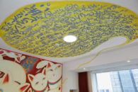 The theme of this room is Lucky Cat, and Japanese famous author Soseki Natsume is the key player behind theme. The walls acting as the bedside screen feature mysterious Lucky Cat. Among them, Mino has also added beckoning demons and mythical monster cats as a modern motif. Between the Lucky Cats gathering around the bed, a poem about cats by Soseki Natsume can be seen. On the ceiling, Mino has written a message dedicated to Kone, his own departed feline companion for 13 years, borrowing from Soseki Natsume’s first novel “I am a cat”. Mino has arranged the final scene, and then to return to the beginning of the novel in his message. On the opposite wall is a picture of an auspicious symbol of good fortune, carefully painted as though it were hung there. The tattoo-patterned cat, seen from behind, give a tasteful impression.