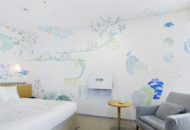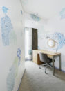 The artist says, “I hope people staying in this room will treat it like a part of their own home, as though taking a stroll in the garden.” The walls, almost like a scroll, feature motifs of traditional Japanese dwellings. To the right, towards the bed, is an open corridor. One proceeds past the adjacent kitchen to the hills. Passing by a small stream, wetlands, a swamp, and another hill brings one to a field, then back home. This unusual white space is where the seasons pass, with the image of mountain ginseng, fern, pepper, and matsutake mushroom adorning the scene.