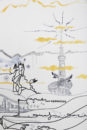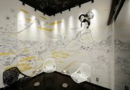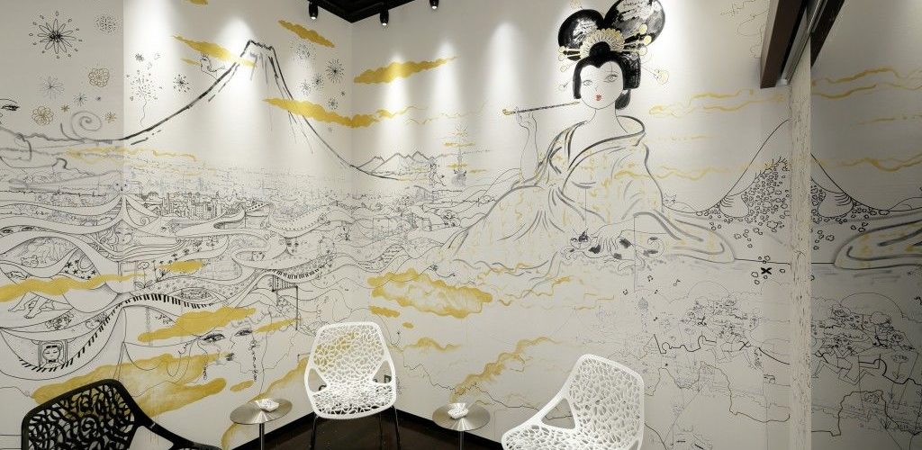As well as nostalgic girls dancing the “cancan”, there’s a mysterious UFO together with Godzilla, cats pacing the floor, and cute, sexy girls. This small smoking area in a hotel in the business town of Shiodome, makes it fun to unwind, relax and have a cigarette, while at the same time, it’s a creative space. An imaginary Tokyo full of chaotic charm covering the walls as if from a bird’s eye view, matches the real bird’s eye view of the ground looking down from the 25th floor – enjoy the image trip.